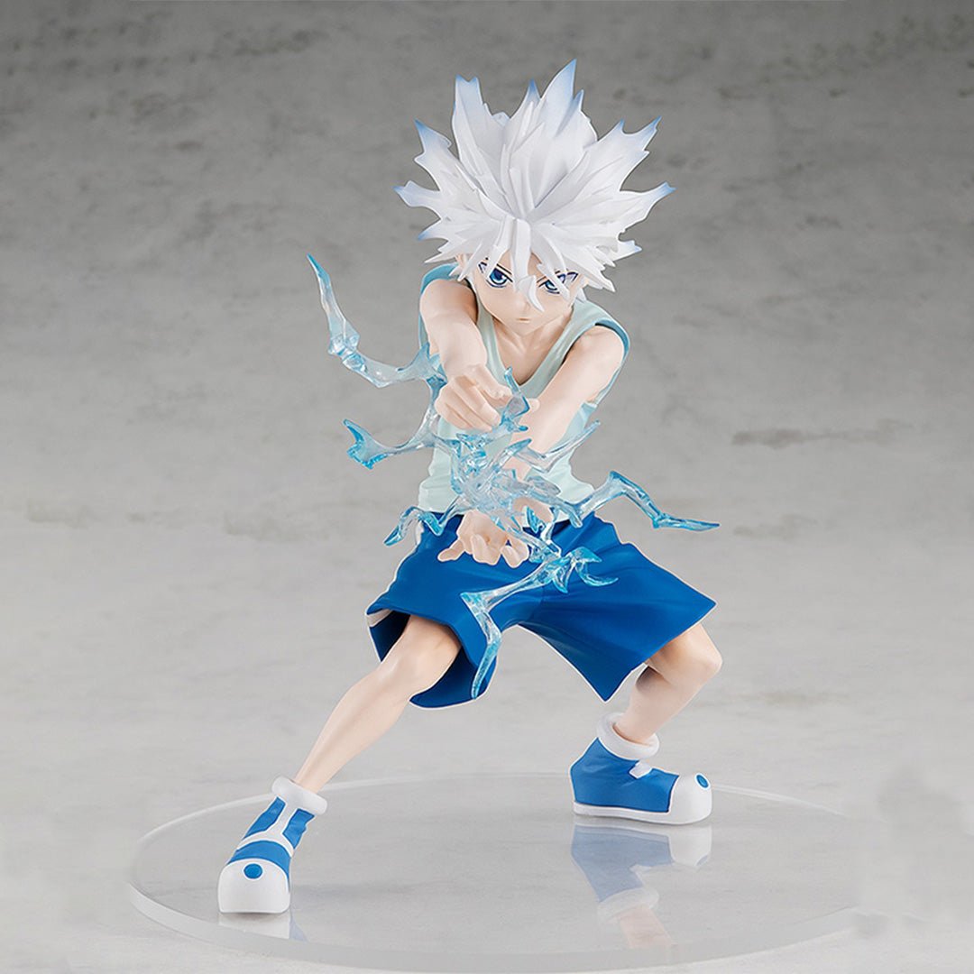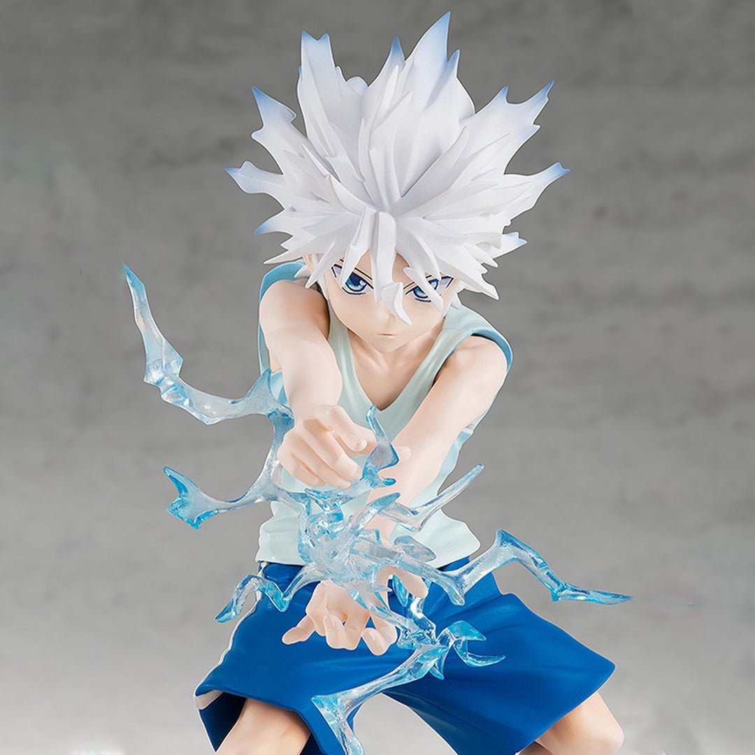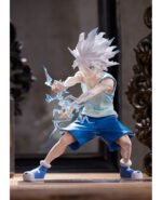 La figurine se distingue par sa pose dynamique, capturant l’instant où Killua concentre son pouvoir électrique entre ses mains. Vêtu d’un short bleu et d’un débardeur blanc, chaque détail de son apparence est soigneusement reproduit, soulignant ses traits distinctifs et son allure charismatique.